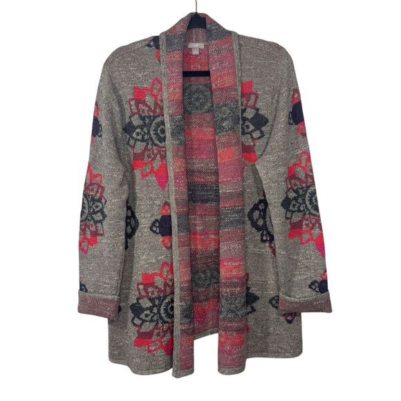 J Jill Open Front Cardigan High Low Grey Boho Aztec Cotton Knit Medium
