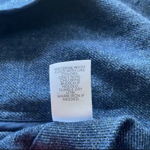 J. Jill Open Front Long Drape Blazer/Chambray Denim Like Business Casual, Front pockets, Size M, Front Pockets, Roll Tab Sleeve, Open Drape (no buttons or closure). Has a distressed look, Shell is 55% Cotton, 45% Rayon, Lining is 100% polyester, it stills has the X threads on the back of the slit to keep it from getting wrinkled or out of shape, Excellent pre owned condition, seems unworn.