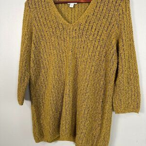 J. Jill Open Knit V-Neck Tunic 3/4 Sleeve Sweater Yellow Womens Large Petite