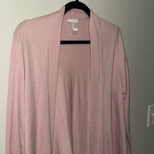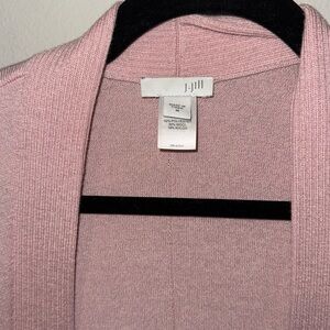 This is a classic open cardigan by J.Jill in a wool blend in a light pink color. Very soft and warm feeling. Long sleeve. Good condition, very minor pilling is some spots but otherwise no flaws.