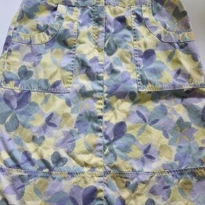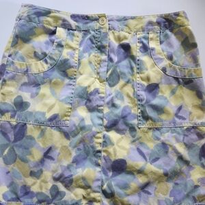 Embrace a vibrant look with this floral patterned skirt. Featuring a blend of yellow, blue, and purple hues, this skirt is perfect for adding a pop of pastel color to your wardrobe.
