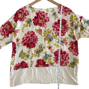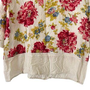 J Jill Petite L Cottage Floral Tunic Boho Boxy Blouse 3/4 Sleeve Lace Trim Rayon