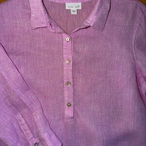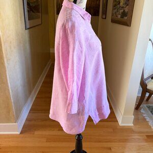 J. Jill Pink Linen Tunic. Half button-up with five (5) buttons. Collar. 3/4 length sleeves with button cuffs. One-tier hemline in the front. Side vents. Longer in the back. Pretty pink vibrant pink color. Not a pale pink. Excellent pre-owned condition Like new, with no known flaws. 100% linen. Size Small - but oversized. Please see measurements for fit.