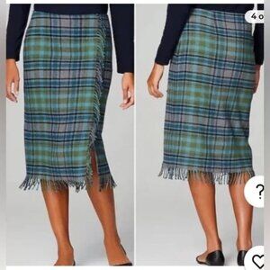 Keywords: J. Jill, Plaid Skirt, Midi Skirt, Wool Blend, Fringe, Tartan, Blue, Green, Faux Wrap, Pencil Skirt, Cottagecore, Academia, Preppy, Fall Fashion, Winter Wear, Countryside, Rustic, Cozy, Layering, Timeless, Classic, Women's Skirt