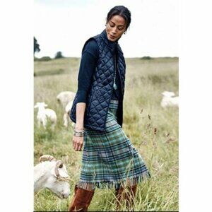 Embrace rustic charm with this beautiful J. Jill plaid midi skirt, perfect for adding a touch of Cottagecore or Academia style to your wardrobe. This wool blend skirt features a classic blue and green tartan plaid pattern with stylish fringe details and a flattering faux wrap or pencil skirt silhouette. Ideal for fall and winter, it offers cozy warmth and timeless style.