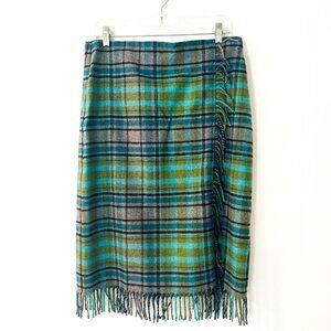 J. Jill Plaid Pencil Skirt Wool Blend Plaid Fringe Blue Green Southwest Boho 12