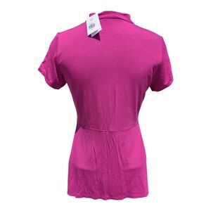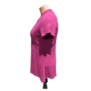 The J Jill Pleated Peplum Tunic Top in size small is a versatile and stylish piece perfect for casual occasions. Made from a light and stretchy rayon fabric, this button-up top features a crew neck and short cap sleeves for comfort. The pleated design adds a touch of sophistication to the classic tunic style, while the wine berry pink color adds a pop of brightness. Machine washable and suitable for all seasons, this top is a must-have for any woman's wardrobe, offering a blend of designer appeal and timeless simplicity.