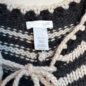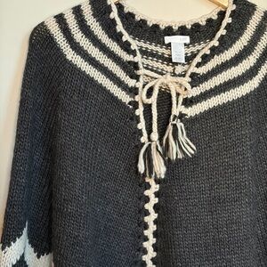 Chic black and cream cardigan with bold patterns. Features a stylish tie front. Ideal for layering.