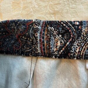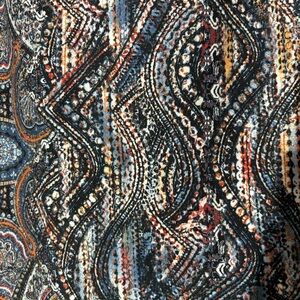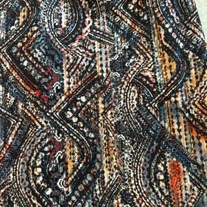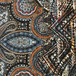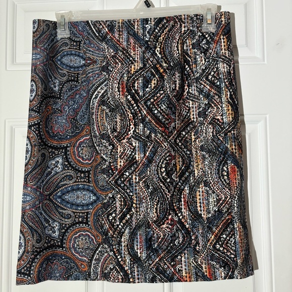 This is a pretty stretchy paisley pencil skirt. Colors in skirt are shades of blue, black, tan, orange and white. Skirt has a 2” stretchy waistband. Fabric content is 85% viscose rayon, 10% nylon and 5% spandex, machine washable. Measurements are length 21 inches and waistband approximately 32 inches.