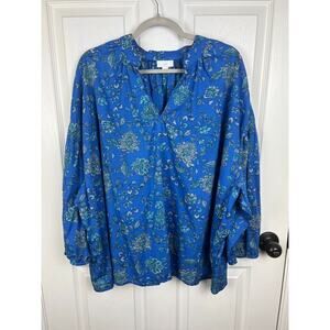 J Jill Popover Blue Floral Paisley Balloon Sleeve Blouse Plus Size 3X/4X Cotton