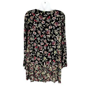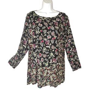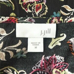 J Jill Pullover Top M Black Floral Peplum Long Sleeves Purple Green White Tunic Preppy