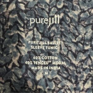 NEW with tags attached. J. Jill Pure Jill Ballet Sleeve Tunic in size Medium. Blue leaf pattern, scoop neck. 60% cotton/40% tencel modal. Great transitional piece for fall