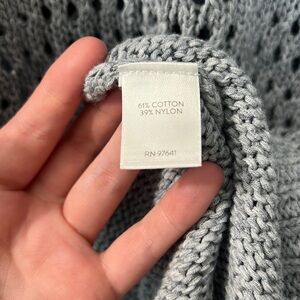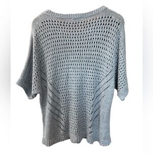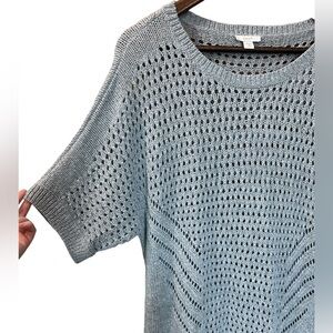 Like-new pure jill by J. Jill open knit crochet tunic blouse. Excellent condition with no signs of wear. Size Medium Petite. Pretty gray/blue color. Scoop neckline. Wide sleeves. Would be really nice layered with a tank top underneath. Perfect for warmer Spring weather.