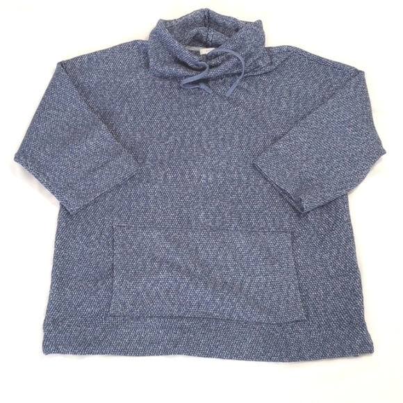 This is a Pure Jill J Jill pullover in blue. It has a drawstring at the neck and a pocket in the front. It has side slits. It is a tunic style and oversized. It is a size small and is in good condition.