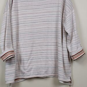 J. Jill Purejill Bisque Lovely Stripe Inside Out Oversized Long Shirt. This fun shirt features a round neckline, on-seam pockets, tunic length, side vents and dropped shoulders in an inside out striped fabric. Soft and cozy 100% cotton. Size Petite XL.