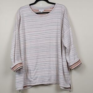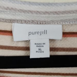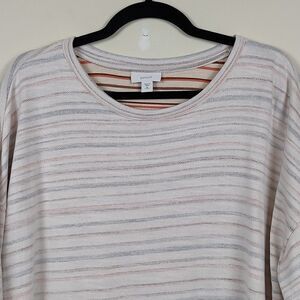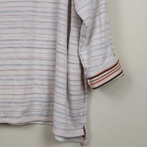 J. Jill Purejill Bisque Lovely Stripe Inside Out Oversized Long Shirt. This fun shirt features a round neckline, on-seam pockets, tunic length, side vents and dropped shoulders in an inside out striped fabric. Soft and cozy 100% cotton. Size Petite XL.