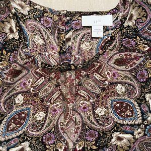 Floral print blouse from J. Jill with long, ruffly slit bell sleeves, small keyhole opening at center neckline, and button closure in back.