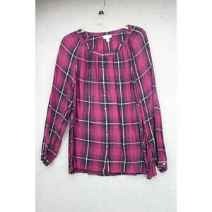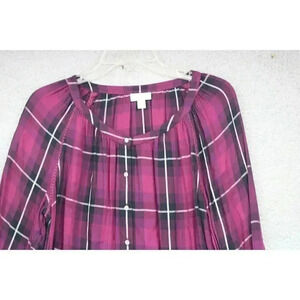 This is a pretty purple plaid J. Jill button-up tunic top that is a size Large. It is 100% Rayon. Laying flat, it measures: Armpit to armpit-22.5" and the length is 28.5". It is in great condition and is very soft.
