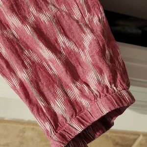Lightweight raspberry pink patterned blouse with a relaxed V-neck silhouette. Soft, flowing fabric for comfortable all-day wear. Versatile style that pairs easily with jeans or skirts. Features subtle cream accents in the print. Approximate measurements are PTP 27 inches and length 27 inches.