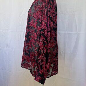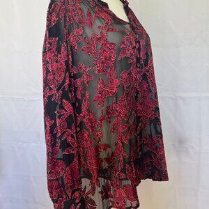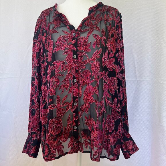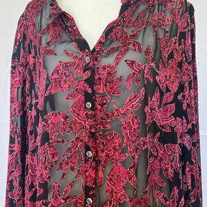 Great for going to a party or out to dinner. This button-front vibrant top is sheer so a black camisole underneath would be perfect!