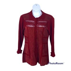 Elevate your wardrobe with this gorgeous J. Jill cardigan! This vintage-inspired piece features a unique combination of rustic red knit, crochet details, and genuine leather patchwork. The long length and full button front add a touch of elegance, while the ribbed collar and sleeves provide cozy comfort.
