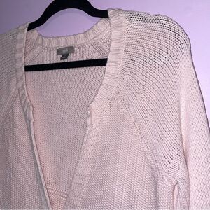 Stylish light pink cardigan. Single button closure. Comfortable and chic.