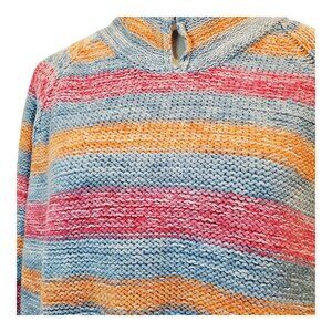Colorful striped pullover sweater that features horizontal stripes in a vibrant color palette including coral/salmon pink, blue-gray, orange, and cream tones.