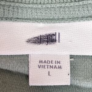 J. Jill Light Sage Green V-neck Knit Top Long Sleeves Large Front Pockets Casual. Heavy knit that feels almost like a sweater. 90% cotton, 10% polyester. Two front patch pockets. Button cuff detail, not functional.