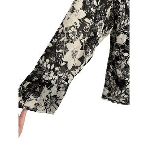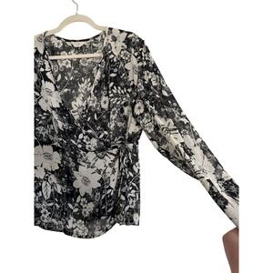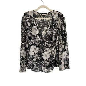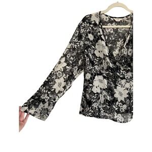 J. Jill Sheer Wrap Blouse Black and Cream Botanical Print Size 16 Petite
