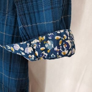 J.Jill Women's Medium Petite Plaid, Floral, Cotton, Soft, Gauzy, Button Front, Flip Cuff with Pockets Shirt Dress. Perfect for fall with some tights and tall boots, or wear open with your favorite cami and some denim! Freshly washed. EUC! Gorgeous fall colors of dark teal blue, black, mustard, and some white in the floral pattern, with brown buttons.