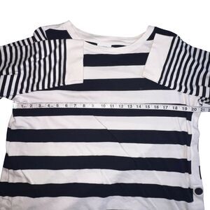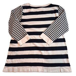 This J. Jill shirt is perfect for any casual occasion. The navy striped blouse features a round neckline and 3/4 sleeves with button accents. It is made of organic cotton fabric, which makes it eco-friendly and safe for your health. The shirt is machine washable, making it easy to care for and maintain its quality. In addition, the shirt has a tunic style and is available in size L. It is suitable for all seasons and has stretch features, ensuring your comfort throughout the day. The shirt is perfect for outdoor activities, such as hiking or picnicking, and can complement any earthy, boho, or preppy outfit. Measures 27 inches long and a 42-inch chest.