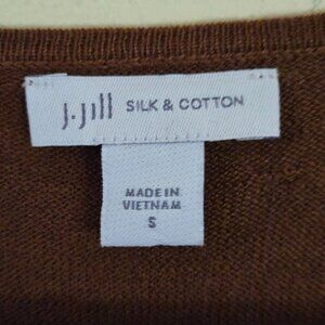 Classic Caramel Brown V-neck sweater from J. Jill made from a luxurious silk cotton blend. This timeless design in size small is perfect for any occasion, offering a comfortable fit with a touch of elegance.