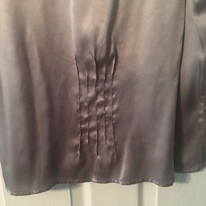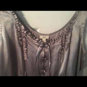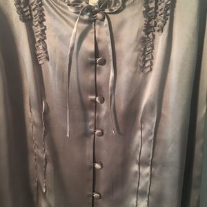 100% Silk, ruffled detail and ribbon tie at the collar, silk covered buttons, tapered in the front and back (runs small) Really cute!!! Looks great with jeans and dress pants; and looks great alone or layered. NWT