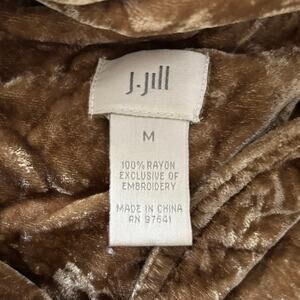 J. Jill velvet button front jacket. Lightweight. Embroidered back and hem. This is the hardest color to describe. It is a mixture of brown, tan, gold, and green. Size Medium. Preowned, no flaws.