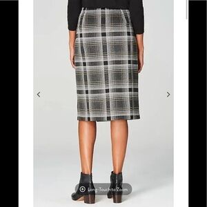 Our classic skirt is made from flattering, softly structured ponte knit you will love with front crossover panel for the look of a wrap. The allover yarn dyed plaid pattern is timeliness. The right amount of stretch, and elastic waist and back darts to ensure and easy fit.