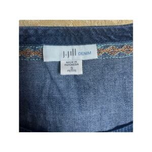 J. Jill Small Petite Denim Dress Sleeveless Embroidered Pockets Fringe Hem Shift