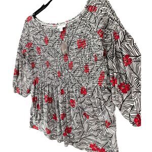 J Jill Tunic Top Womens Size M Black White Red Floral Print 3/4 On Off Shoulder Boho