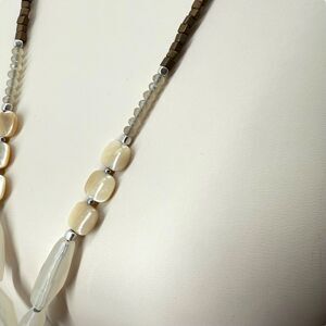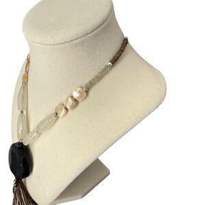 Elevate your style with this stunning J.Jill long beaded necklace, featuring a faceted agate stone pendant with a dramatic tassel drop. Accented with mother of pearl beads, glass beads, and earthy tones, this versatile piece blends natural beauty with bohemian elegance.