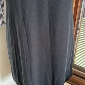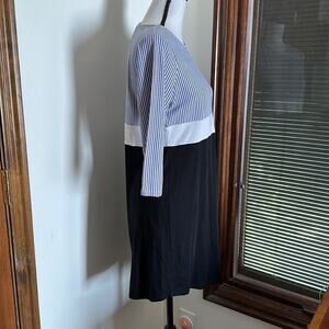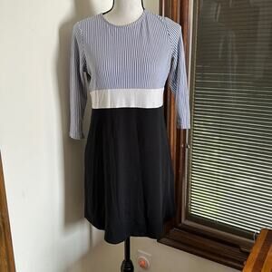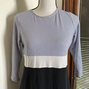 This is an incredibly soft dress. Top has blue and white stripes with 3/4 length sleeves. Middle is a white strip and bottom is black. In great used condition, no flaws or damage to note.