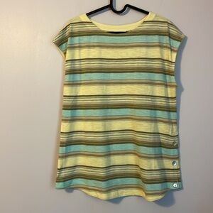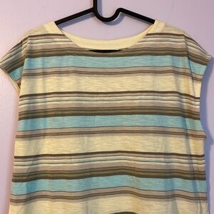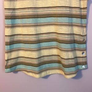 J. Jill Striped Shell Button Detail Tank Top size S. Yellow brown blue tan. Burnout look to lighter colors. Down one side in front there are large shell buttons. Iridescent shiny buttons. Sleeveless. See pictures for approximate measurements.