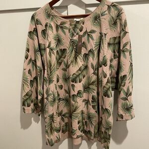 J Jill Sweater Women Petite LP Pink Green Pullover Royal Palm Leaf Printed NWT