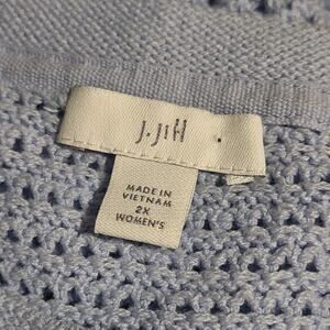 This J. Jill sweater is in excellent preowned condition and has barely been worn - no flaws. Baby Blue. Short Cap Sleeves. Loose Knit. Cotton, Rayon, Nylon. Size 2X.