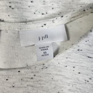 The J. Jill sweatshirt in cream with black speckled heather is a stylish and versatile top for women. Made from a blend of nylon, rayon, and spandex, this 3/4 sleeve pullover features a relaxed fit and a button closure at the back. The round neck and tunic style make it suitable for both casual and dressy occasions, while the stretch fabric offers comfort and flexibility. Perfect for petite women in size XS, this top is a great addition to any wardrobe, combining style and functionality for a chic look.
