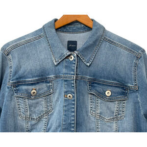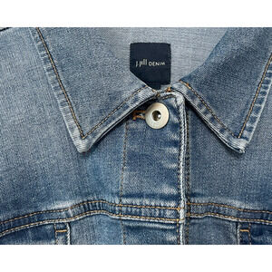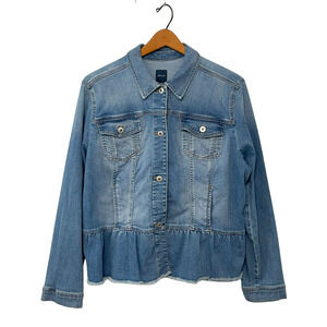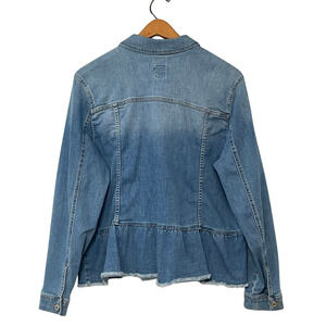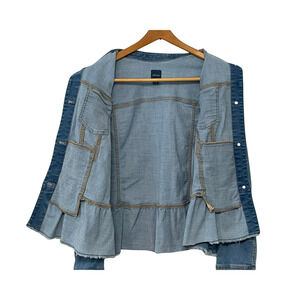 J. Jill Sz L Jean Jacket Button Front Ruffle Peplum Distressed Blue Denim Retro