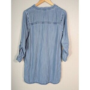 This J. Jill denim shirt dress in size XS petite features a solid blue color with a collared neckline and button closure. The long sleeves have roll tab sleeves for versatile styling. Made of cotton denim, it has a knee-length design perfect for casual or travel occasions. The dress embodies a beach, bohemian, and classic theme, suitable for summer, fall, and spring seasons.