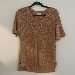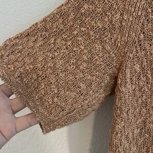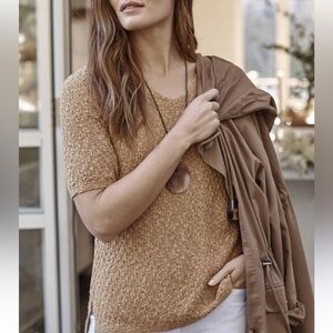 This is the loveliest sweater ever! This is the Dimensional Elbow Sleeve Sweater in the color Gingersnap, a gorgeous light caramel brown.