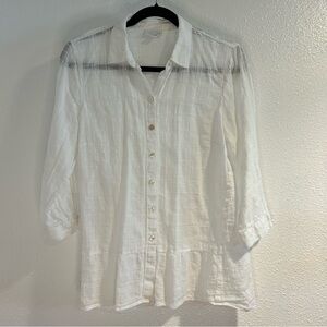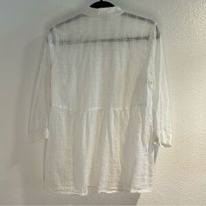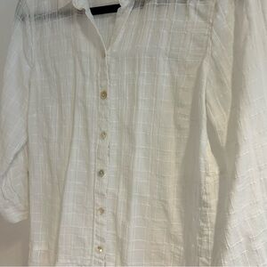 Chic white button-down with textured fabric. Ideal for casual or formal wear. Features classic collar and button cuffs.