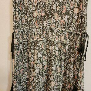 The J Jill TierMaxi Floral Dress in Women's size L is a stylish and comfortable boho piece perfect for casual outings, workwear, or even travel. Featuring a V-neckline, sleeveless design, and tasseled accents, this knee-length dress is made from breathable rayon fabric in a khaki green color. The floral pattern and tiered silhouette give off a cottage core vibe, making it ideal for summer, fall, or spring occasions with an island or festival feel. Perfect for those who appreciate a feminine and relaxed look with a touch of bohemian flair. In Excellent Pre-Owned Condition. Please pay attention to the measurements, this is final sale no return for reason of measurement except the product not like the description when you receive.