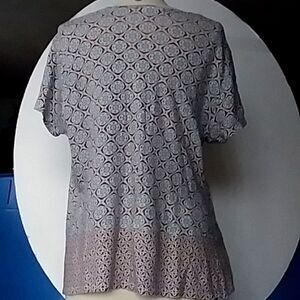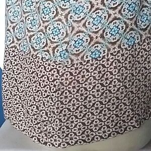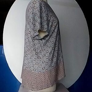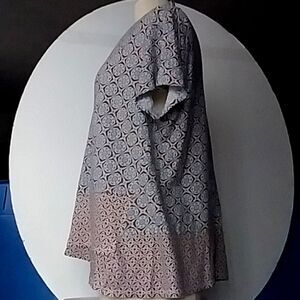J. Jill Love Linen brand blouse / tunic style shirt. Really stylish and comfortable and 100% linen. It is an XL Tall. Please see measurements below. Great moroccan tile look print with a patchwork hem that has a lot of interesting detail on the left side. This top is slow to wrinkle despite the 100% linen content and is unbelievably soft. It has the feel of a cotton tee shirt only much softer. Excellent pre-owned condition with no flaws.