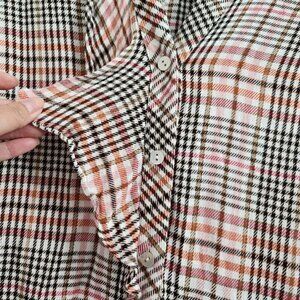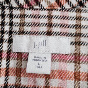 J. Jill Top Large Tall Pink Brown Houndstooth Plaid Ruffled Button Up Blouse.